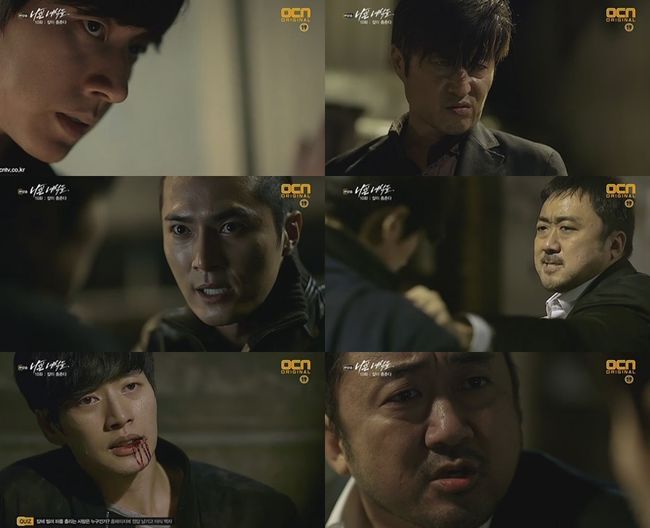 이날 특수범죄수사팀으로 함께 행동하던 네 남자는 서로를 향한 칼을 겨누게 됐다. 우선 박웅철(마동석 분)은 이정문(박해진 분)이 자신의 형님을 죽인 살해범이라는 생각에 복수심을 불태웠다. 그는 자신의 부하들을 모두 동원해 이정문을 쫓았고 그의 행방을 알아냈다.