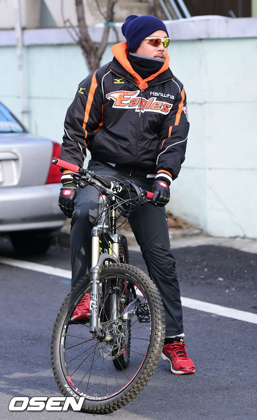 7일 대전 부사동에서 진행된 한화 이글스의 '사랑의 연탄배달' 행사에서 한화 이용규가 자전거로 봉사활동 장소로 이동하고 있다.