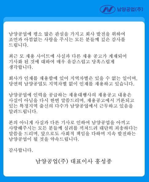 남양공업 측은 “남양공업에 인력을 공급하는 채용대행사의 채용공고 내용은 사실이 아님을 다시 한 번 말씀드리며, 채용공고에서 거론되고 있는 특정지역 출신의 다수가 남양공업에서 근무하고 있음을 알려드립니다”라고 덧붙였다.