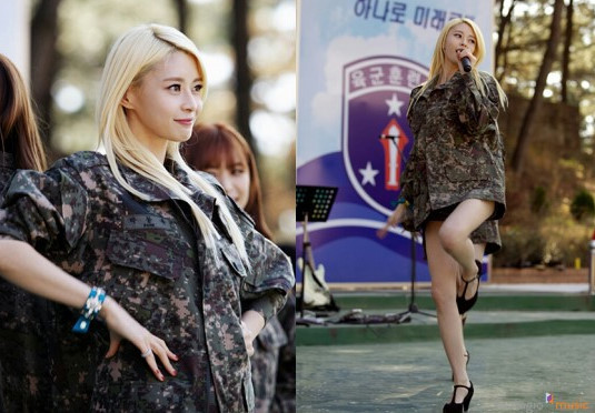 진짜 여군이 이렇게 섹시하고 멋질수 있을까? 걸그룹 헬로비너스의 늘씬 미녀 멤버 나라의 군복 패션이 네티즌 사이에서 꾸준히 화제를 모으고 있다. 야전 상의를 폼나게 걸친 나라가 하의실종 패션으로 군부대 위문공연을 펼니는 모습이다.