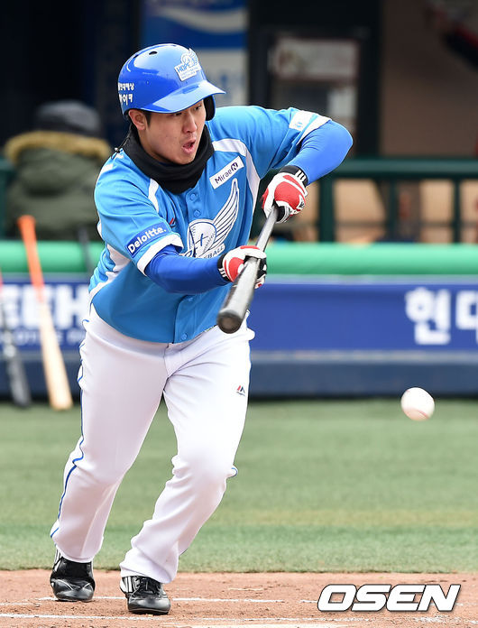 1회초 종범신팀 최정이 번트를 시도하고 있다.