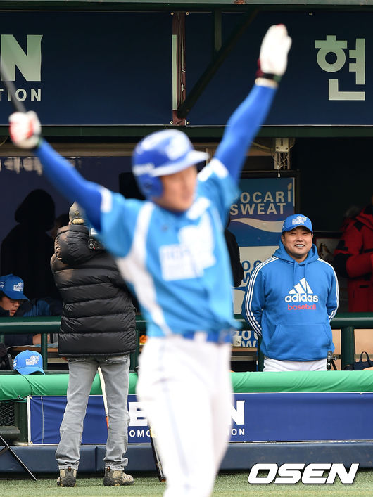 4회초 양준혁이 자신의 타격 자세를 흉내내는 이여상을 보며 미소를 짓고 있다.