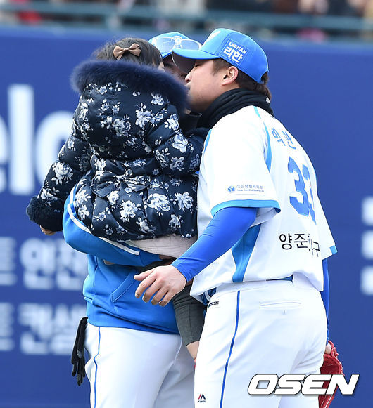 5회초 양신팀 박한이가 응원을 나온 딸과 뽀뽀를 하고 있다.