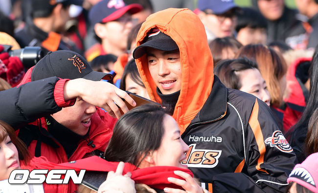 7일 오후 대전구장에서 진행된 한화 이글스 '2014 독수리 한마당'에서 한화 이태양이 팬들과 셀카를 찍고 있다.