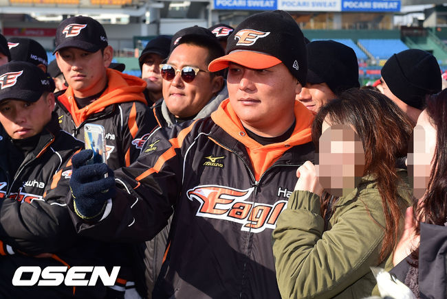 7일 오후 대전구장에서 진행된 한화 이글스 '2014 독수리 한마당'에서 한화 김태균이 팬들과 셀카를 찍고 있다.