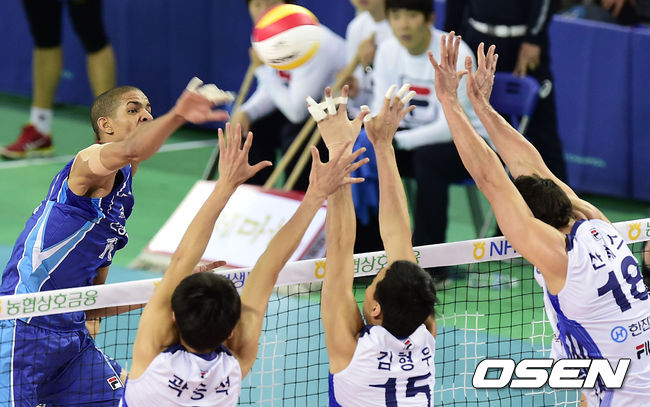 7일 오후 인천 계양체육관에서 열린 '2014-2015 NH농협 V-리그' 대한항공과 삼성화재의 경기, 1세트 삼성화재 레오의 스파이크를 대한항공 곽승석,김형우,산체스가 블로킹 시도하고 있다.