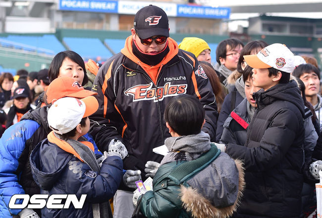 7일 오후 대전구장에서 진행된 한화 이글스 '2014 독수리 한마당'에서 한화 김태완이 꼬마 팬들과 이야기를 나누고 있다.