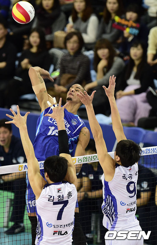 7일 오후 인천 계양체육관에서 열린 '2014-2015 NH농협 V-리그' 대한항공과 삼성화재의 경기, 1세트 삼성화재 레오의 스파이크를 대한항공 김철홍, 곽승혁이 블로킹 시도하고 있다.