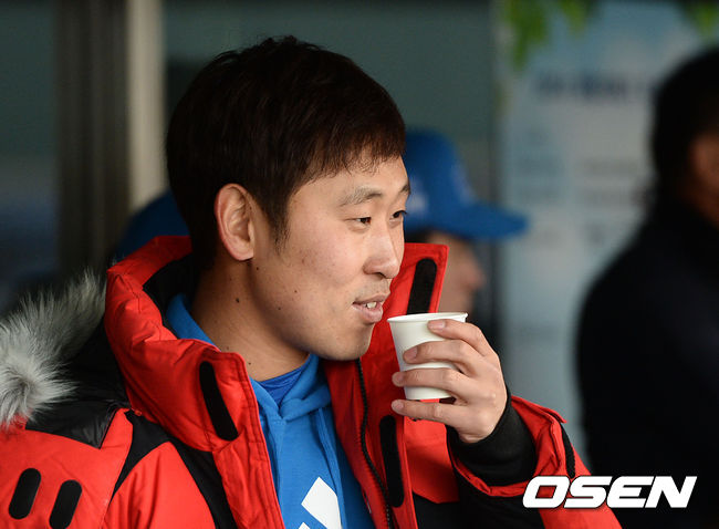윤석민이 커피를 마시고 있다.