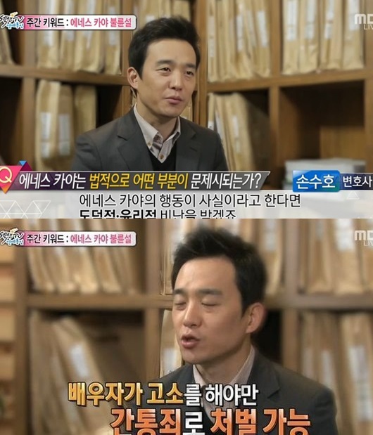 7일 방송된 MBC '섹션TV 연예통신' 에서는 일주일간 연예계를 뜨겁게 달궜던 에너스 카야의 불륜설을 방송했다. 이날 손수호 변호사가 출연해 이번 사건의 형사처벌 가능성에 대해 밝혔다.