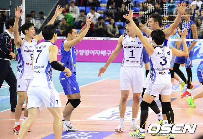 대한항공은 7일 인천계양체육관에서 열린 ‘2014-2015 NH농협 V-리그’ 남자부 삼성화재와의 경기에서 좌우에서 활발한 공격을 펼친 산체스와 신영수의 활약에 힘입어 3-1(32-30, 25-21, 22-25, 25-22)로 이겼다.
