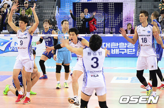 대한항공은 7일 인천계양체육관에서 열린 ‘2014-2015 NH농협 V-리그’ 남자부 삼성화재와의 경기에서 좌우에서 활발한 공격을 펼친 산체스와 신영수의 활약에 힘입어 3-1(32-30, 25-21, 22-25, 25-22)로 이겼다.