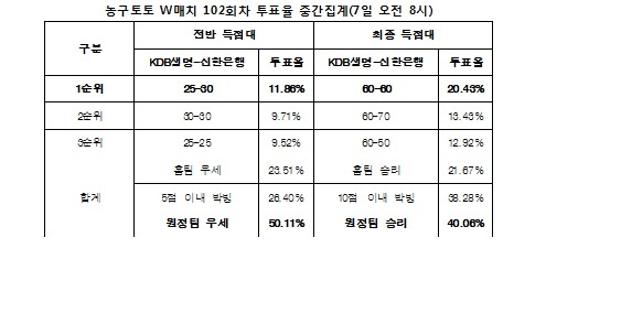 2014-2015시즌 농구토토 W매치 102회차 투표율 중간집계 결과…신한은행 우세 전망