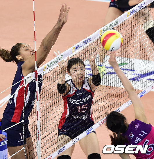 7일 오후 인천 계양체육관에서 열린 '2014-2015 프로배구 V리그 여자부' 흥국생명과 인삼공사의 경기, 1세트 흥국생명 주예나의 스파이크를 인삼공사 조이스가 블로킹 시도하고 있다.