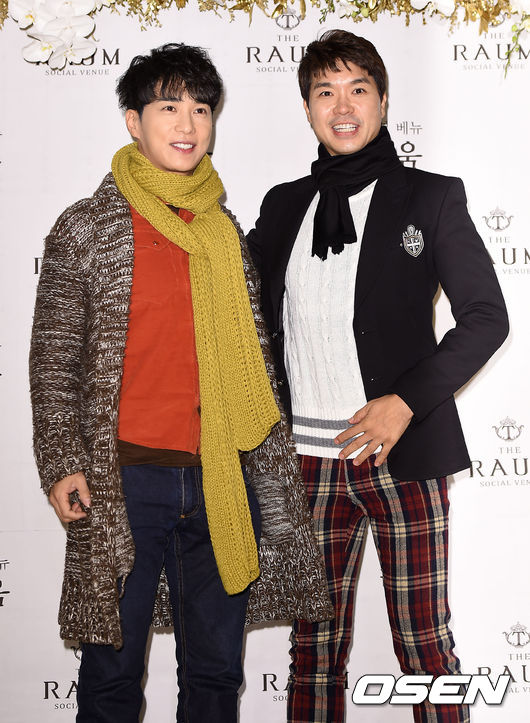 가수 김원준과 개그맨 박수홍이 포토타임을 갖고 있다.