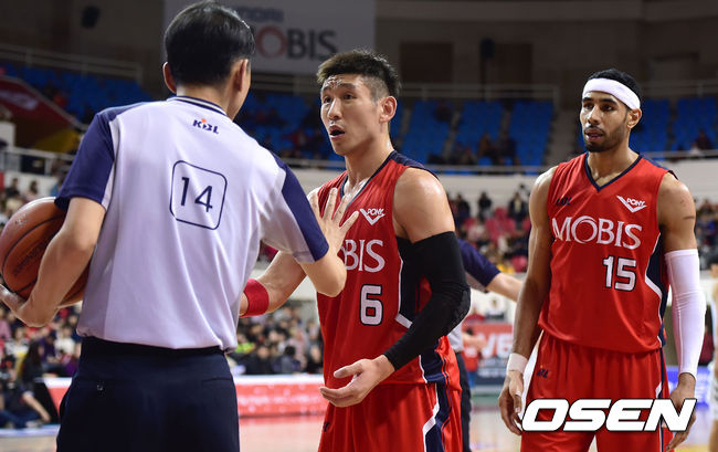 4쿼터 모비스 양동근이 문태영의 테크니컬 파울에 대해 주심에게 어필하고 있다.