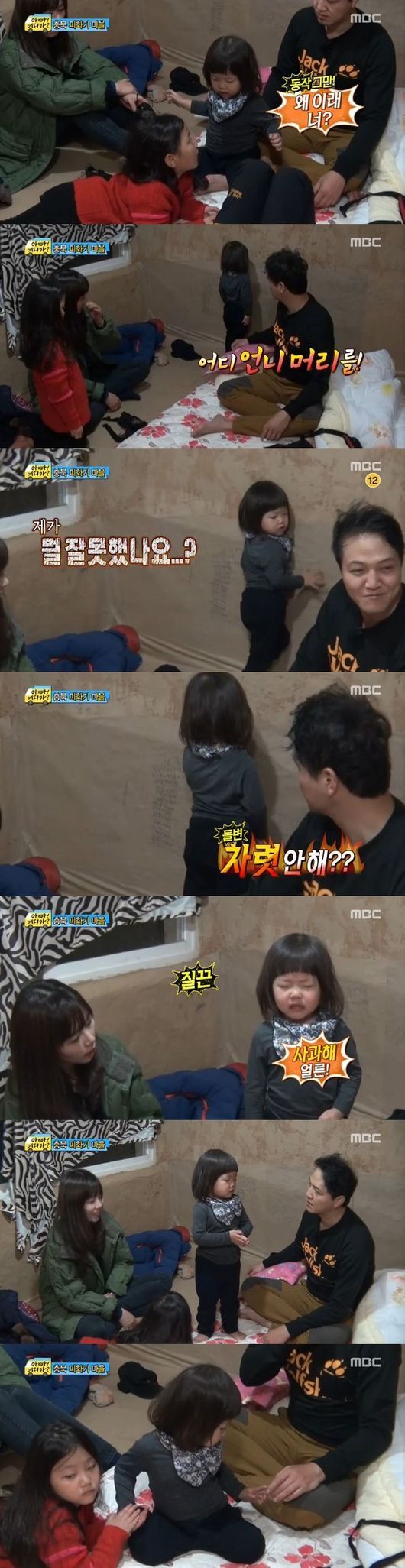 배우 정웅인의 막내 딸 다윤이가 언니의 머리를 잡아 당겼다가 벌을 받았다.