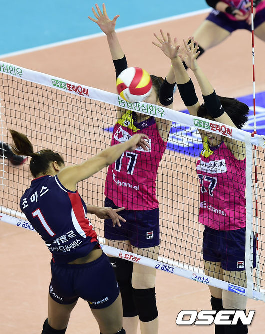 7일 오후 인천 계양체육관에서 열린 '2014-2015 프로배구 V리그 여자부' 흥국생명과 인삼공사의 경기, 3세트 인삼공사 조이스의 스파이크가 흥국생명 김수지의 얼굴로 향하고 있다.