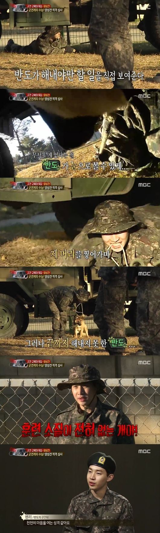 헨리는 7일 오후 방송된 MBC 예능프로그램 '일밤-진짜사나이'(이하 '진짜사나이')에서 우울증 군견 반도를 데리고 양성견 적격 심사에 참석했다.