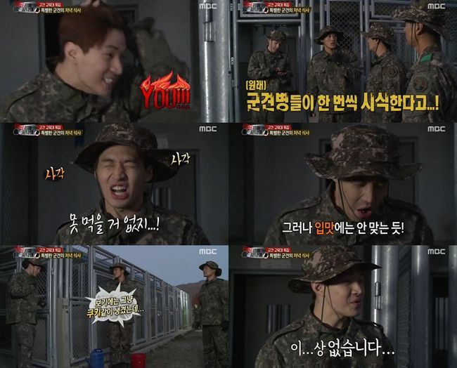 결국 헨리는 손 위에 개사료를 모두 입에 털어넣고, 울상을 지어보여 웃음을 자아냈다. "내일까지 괜찮으면 이 사료를 계속 군견들에 먹이겠다"는 멤버들의 이야기에 헨리는 "이상없다"고 응수했다.