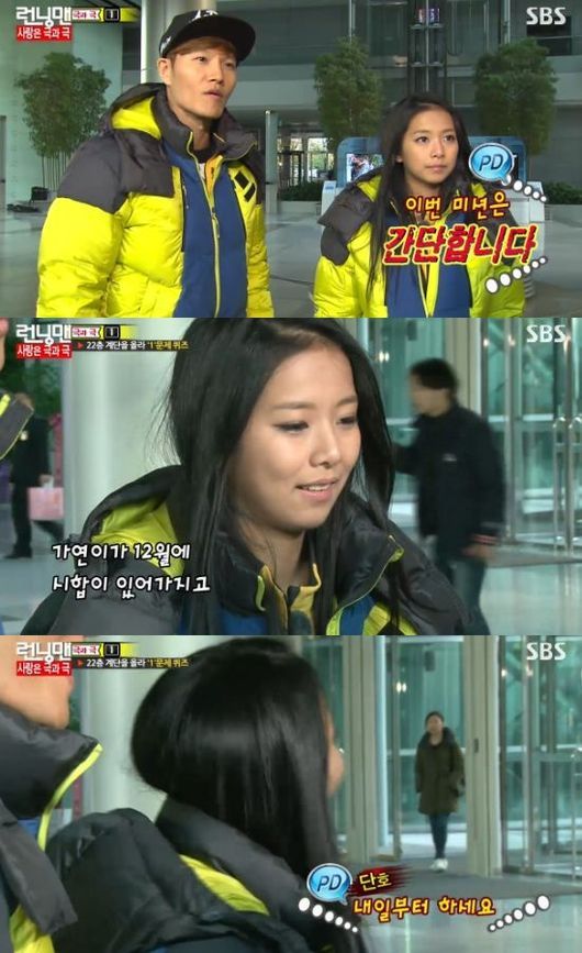 김종국은 7일 오후 방송된 SBS 예능프로그램 '일요일이 좋다-런닝맨'에서 송가연에게 한문제를 내고 그 문제를 맞추면 통과하는 미션에 임했다. 문제는 과정이었다. 바로 김종국이 22층 계단을 올라 직접 문제를 전달해야했던 것.
