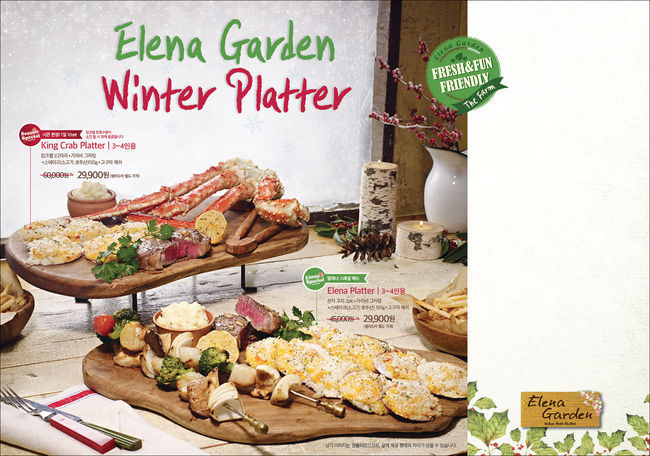 엘레나가든이 새롭게 마련한 '윈터 플래터' 2종은 크리스마스, 송년회 등 모임이 많은 연말에 맞춰 3~4명이 푸짐하게 먹을 수 있는 '킹 크랩 플래터(King Crab Platter)'와 '엘레나 플래터(Elena Platter)' 2종으로 구성했다. '킹 크랩 플래터'는 킹크랩, 가리비 그라탕, 스테이크, 고구마 매쉬로 구성해 해산물부터 스테이크까지 취향에 따라 다양하게 즐길 수 있다. '킹 크랩 플래터'는 신선한 킹크랩을 제공하고자 한정 수량에 한해 판매한다. '엘레나 플래터' 주문 시에는 관자 꼬치와 가리비 그라탕, 스테이크, 고구마 매쉬를 맛볼 수 있다.