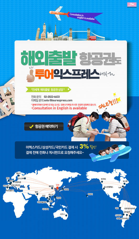 투어익스프레스에서는 현재 전세계 해외 출발 항공권 기획전을 통해 전세계 어디서든 출발하는 항공권 상담도 진행하고 있다. 실시간 조회 및 예약이 가능하고 외국인을 위한 영어 상담도 가능하다. 홈페이지를 통해 확인할 수 없는 도시나 특별히 가고 싶은 도시는 전화 혹은 이메일을 통한 상담이 가능해 이용자들의 편의까지 챙긴 상태다.