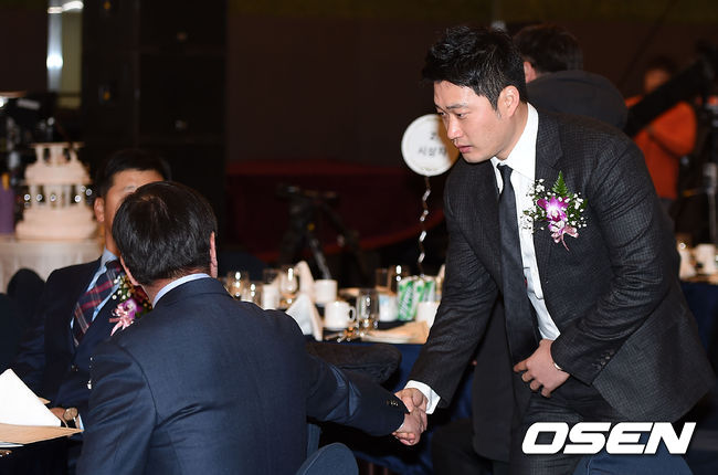 시상식에 앞서 한신 오승환이 삼성 류중일 감독과 인사를 나누고 있다.