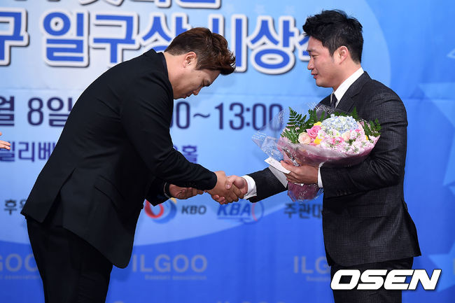 시상하는 류현진,'선배 오승환에게 깍듯하게'