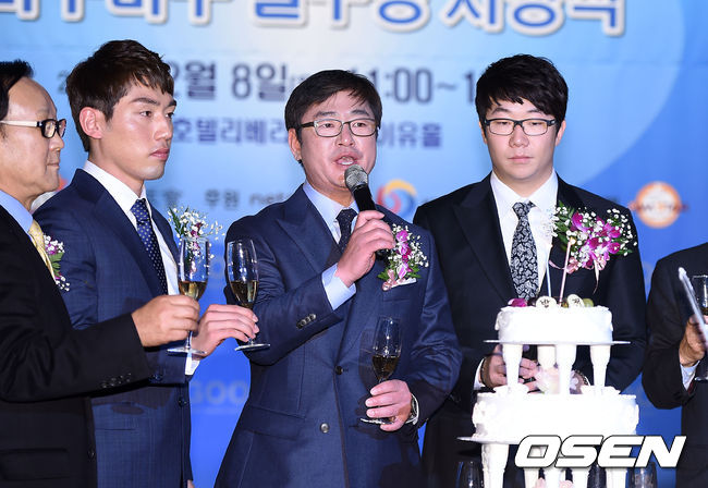 지도자상을 수상한 삼성 류중일 감독이 건배 제의를 하고 있다.