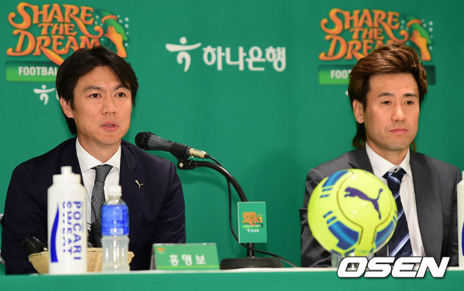 8일 오후 서울 반포동 서울팔래스 호텔에서 열린 '하나은행과 함께하는 Share the Dream Football Match 2014' 미디어데이 행사에 홍명보와 김병지가 참석하고 있다.