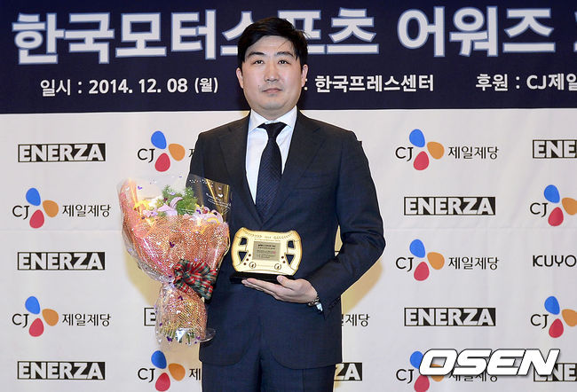 8일 오후 서울 중구 태평로 한국프레스센터 매화홀에서 열린 '제9회 한국모터스포츠 어워즈 2014' 행사에서 조항우가 올해의 드라이버 대상을 수상하고 포토타임을 갖고 있다.