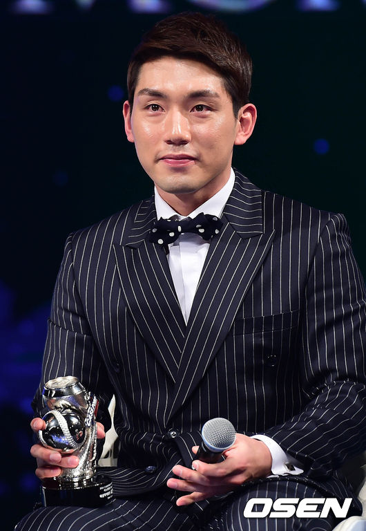 8일 오후 서울 장충동2가 신라호텔에서 열린 '2014 카스포인트 어워즈'에서 '카스모멘트 Best5'에 선정된 서건창이 수상 소감을 말하고 있다.