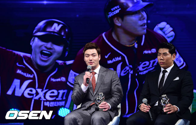 8일 오후 서울 장충동2가 신라호텔에서 열린 '2014 카스포인트 어워즈'에서 타자부문 TOP3에 선정된 박병호와 서건창이 수상 소감을 말하고 있다.