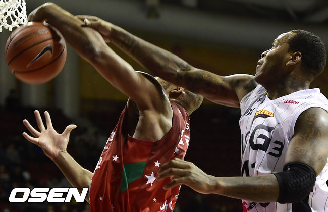 8일 오후 경기도 안양실내체육관에서 열린 '2014-2015 KCC 프로농구' 안양 KGC 와 창원 LG의 경기, 1쿼터 안양 윌리암스와 창원 제퍼슨이 리바운드 경합을 벌이고 있다.