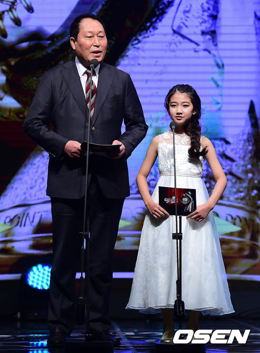 8일 오후 서울 장충동2가 신라호텔에서 열린 '2014 카스포인트 어워즈'에서 김인식과 홍성흔 딸 홍화리가 시상자로 나서고 있다.