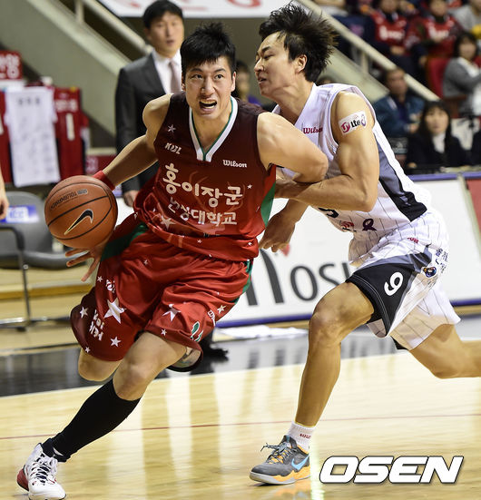8일 오후 경기도 안양실내체육관에서 열린 '2014-2015 KCC 프로농구' 안양 KGC 와 창원 LG의 경기, 3쿼터 안양 양희종이 창원 김영환의 수비를 두고 돌파시도하고 있다.