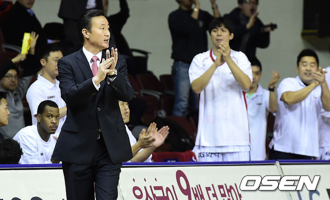 8일 오후 경기도 안양실내체육관에서 열린 '2014-2015 KCC 프로농구' 안양 KGC 와 창원 LG의 경기, 3쿼터 창원 김진 감독이 득점에 성공하자 박수를 치고 있다.