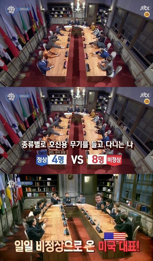 8일 오후 방송된 JTBC 예능프로그램 '비정상회담'에는 아이돌그룹 슈퍼주니어의 멤버 강인과 슈퍼주니어M 멤버 조미가 게스트로 출연한 가운데, '치안'을 주제로 대화를 나누는 G10(샘 오취리, 기욤 패트리, 에네스 카야, 줄리안, 알베르토 몬디, 장위안, 타일러 라쉬, 로빈 데이아나, 타쿠야, 다니엘 린데만)의 모습이 전파를 탔다.