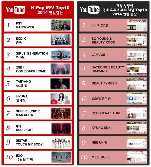세계 최대 동영상 커뮤니티 유튜브(www.youtube.com)가 2014년 한 해 동안 전 세계 사용자들이 유튜브에서 가장 많이 본 K-Pop 뮤직비디오 Top10 및 구독자 수가 가장 많이 증가한 국내 유튜브 채널 Top20를 9일 공개했다. 이와 함께 구독자 수 증가 기준 해당 기간 동안 괄목할만한 성장을 기록한 국내 게임 및 뷰티 관련 채널 Top10도 각각 발표했다.