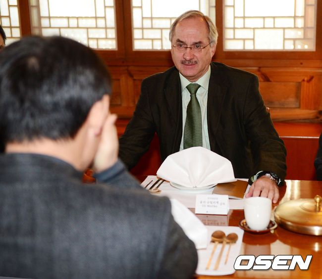 9일 오전 서울 강서구 메이필드호텔에서 마련된 한국 A대표팀 슈틸리케 감독과 K리그 클래식 감독들과의 오찬때 슈틸리케 감독이 얘기를 하고 있다.