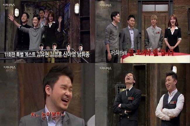 ‘더 지니어스’ 제작진은 “11회 오프닝 촬영장에서 탈락자인 수학강사 남휘종, 스포츠 아나운서 신아영, 프로 포커플레이어 김유현, 서울대 대학원생 김경훈이 살아남은 도전자인 카이스트 재학생 오현민, 개그맨 장동민, 한의사 최연승과 다시 만났다”고 전했다.