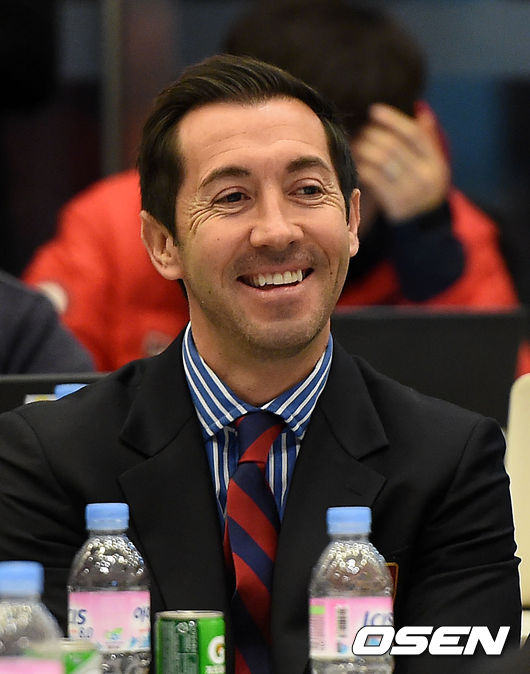 서울이랜드FC 마틴 레니 감독이 관계자들과 이야기를 나누며 미소를 짓고 있다.
