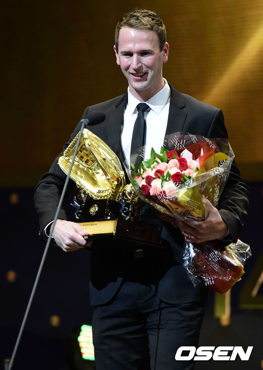 투수부문 골든글러브를 수상한 넥센 밴 헤켄이 수상 소감을 밝히고 있다.
