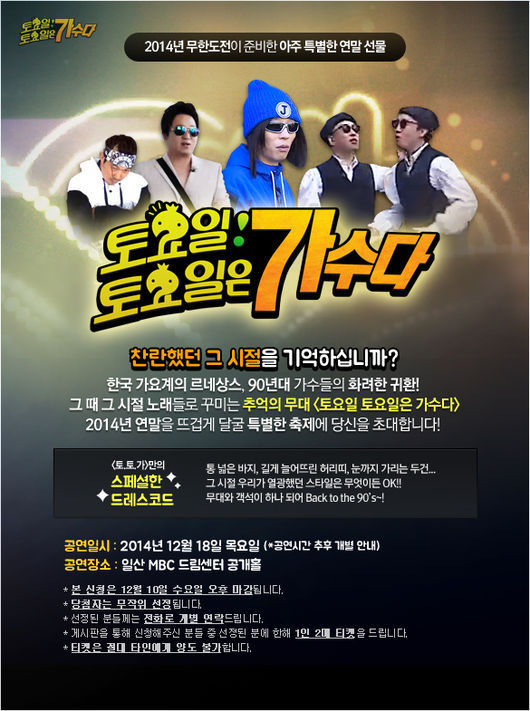 MBC '무한도전'이 야심차게 준비한 '토.토.가'의 공연이 다음주로 다가온 가운데, 공연 좌석이 1000석이 채 되지 않아 경쟁이 치열할 것으로 보인다.