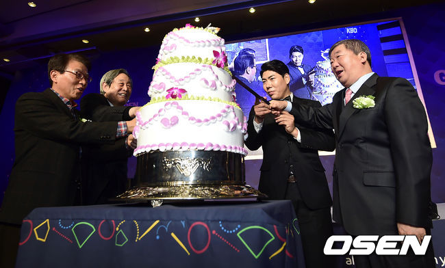 시상식 종료후 열린 만찬에서 구본능 총재와 넥센 강정호가 함께 케이크 커팅식을 하고 있다.