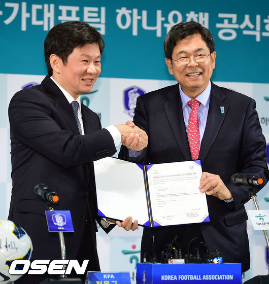 이날 조인식에는 축구대표팀 슈틸리케 감독과 김승규, 정몽규 KFA 회장, 김병호 하나은행 은행장이 참석했다.