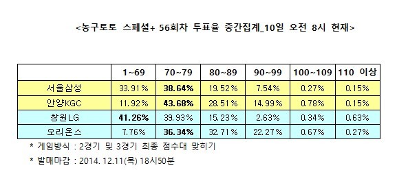 2014-15시즌 KBL 2경기 대상 농구토토 스페셜+ 56회차 투표율 중간집계 결과