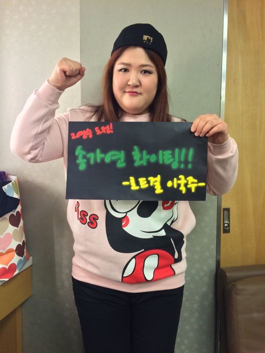 사진 속 이국주는 주먹을 불끈 쥐고 송가연을 응원하고 있다. 특히 이국주는 "2승 도전! 송가연 화이팅!! -로드걸 이국주-"라고 적힌 종이를 들고 힘을 불어넣는 표정을 지으며 '으리파' 이미지를 부각시켰다.