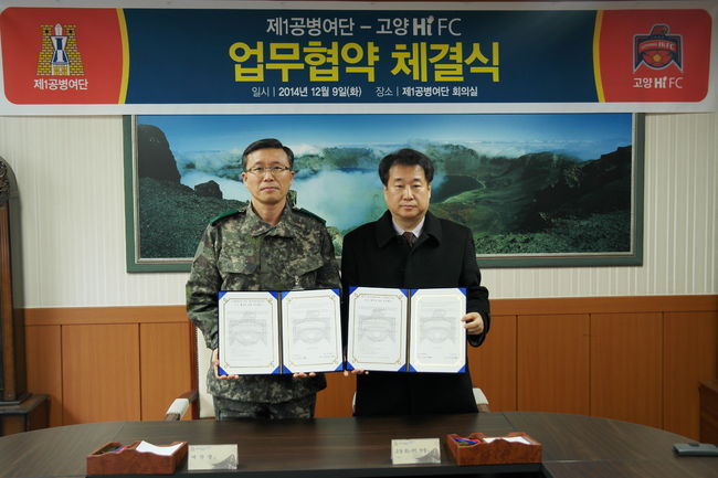 고양 Hi FC(이하 고양)가 지난 9일 육군 제1공병여단(이하 1공병여단)과 경기도 고양시에 위치한 제1공병여단에서 상호 협력체계구축을 위해 업무협약을 체결했다.